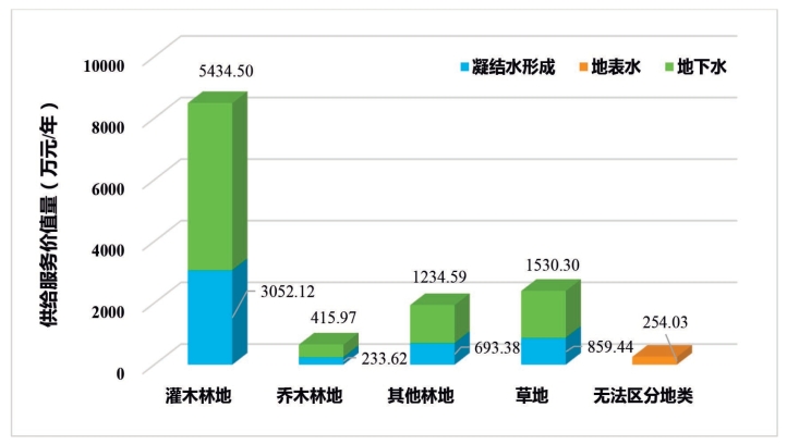 本次评估中,灌木林地、乔木林地、其他林地、草地的单位面积蒸腾耗水量采用对灌木林地蒸腾耗水量的长期监测数据。但是在实际情况中,灌木林地与其他林地、草地的单位面积蒸腾耗水量相差不大,但是乔木林地的单位面积蒸腾耗水量要明显高于灌木林地。因此,乔木林地水资源供给的实际服务功能价值量应比评估结果小一些。