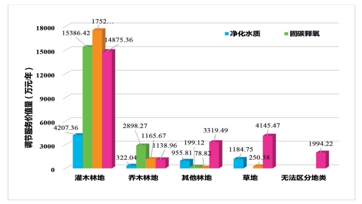 灌木林地是保护区荒漠生态系统调节服务功能价值量贡献率最大的地类,表明灌木在区域生态保障、水体和大气质量改善方面具有重要作用。与此同时,乔木林地、其他林地和草地都具有一定的调节服务价值。由于保护区乔木林、灌木林和草地等共同形成的生态防护作用,促进了牧草和农作物增产,但生态防护作用无法进行地类归属统计和分析。