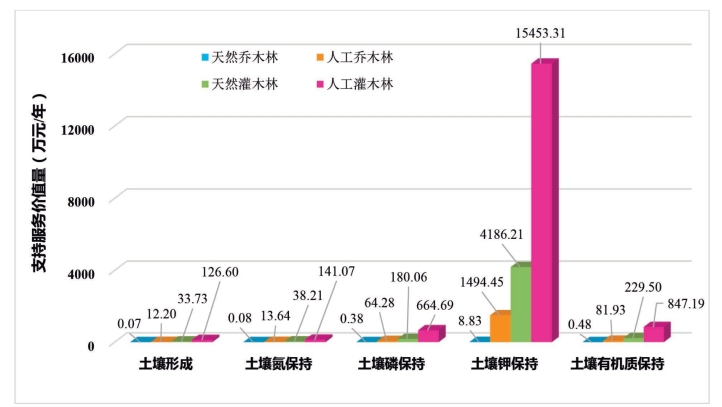 因此,保护区荒漠生态系统在保持土壤养分、维持生物多样性等方面的重要服务功能的价值源,主要为灌木林,应进一步强化对其的管护。同时,也提示保护区管理者,灌木林在区域生态安全防护和生态服务供给方面,具有与乔木林类似甚至更高的功能和价值,加之营造和管护成本较低,应作为保护区及周边区域生态建设的主要植被类型。