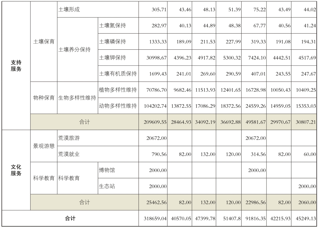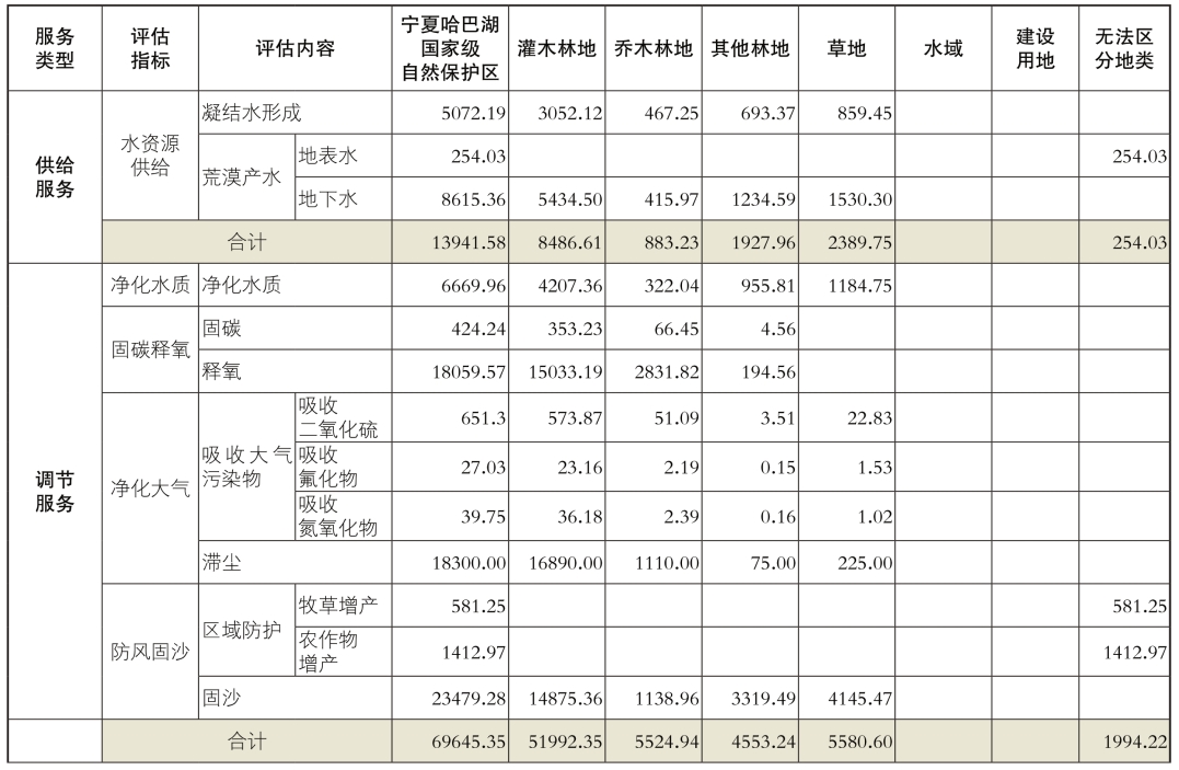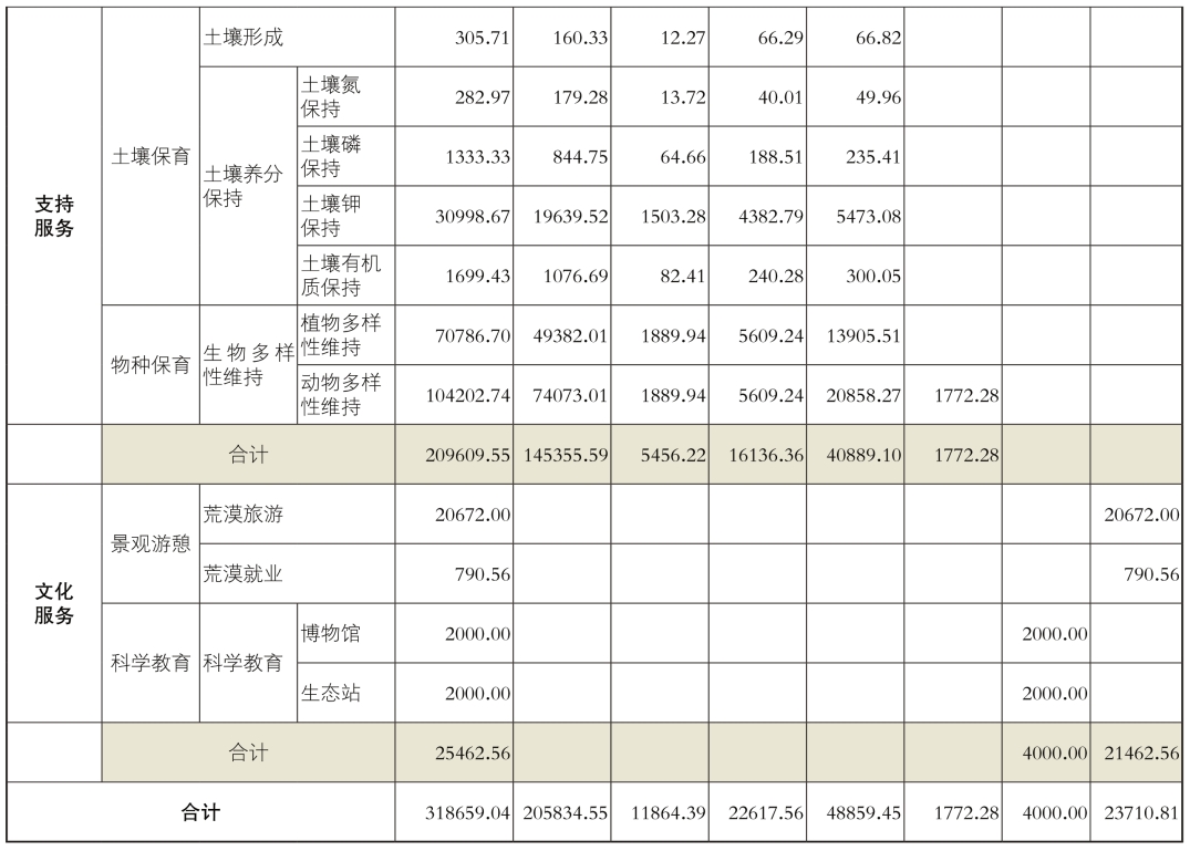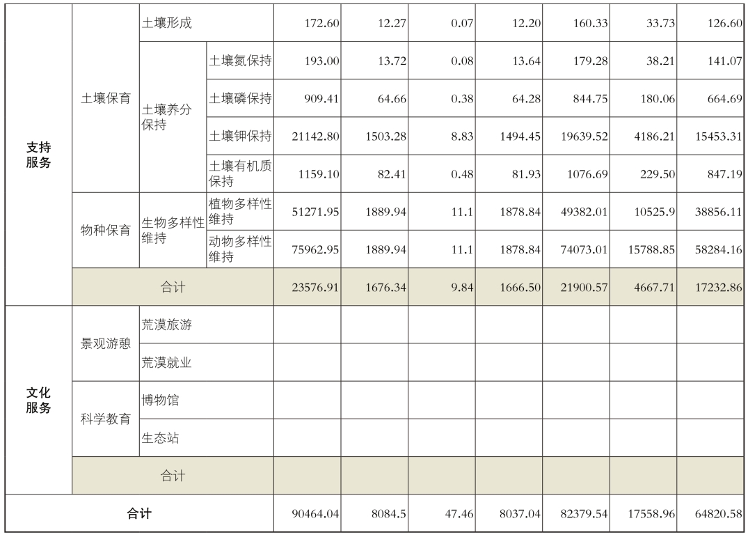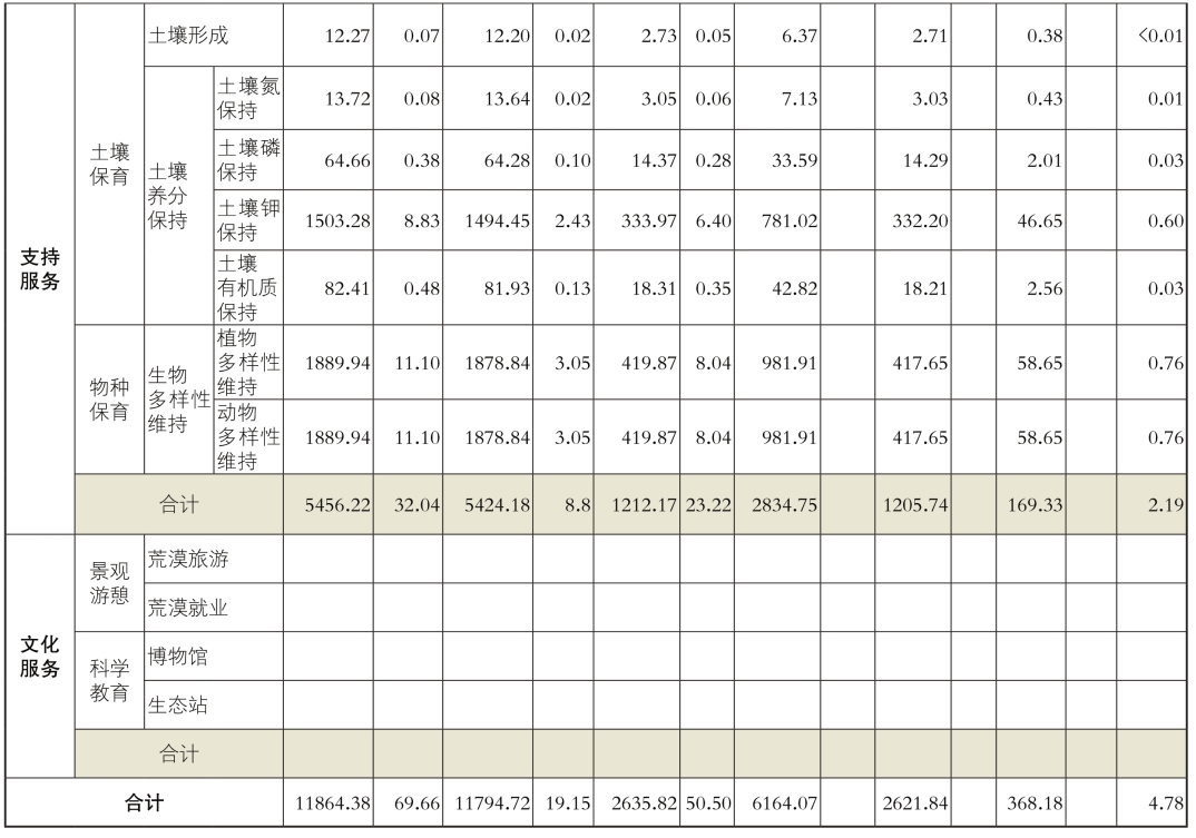 表4-3 保护区荒漠生态系统不同地类服务功能价值量(单位:104 元·a-1)