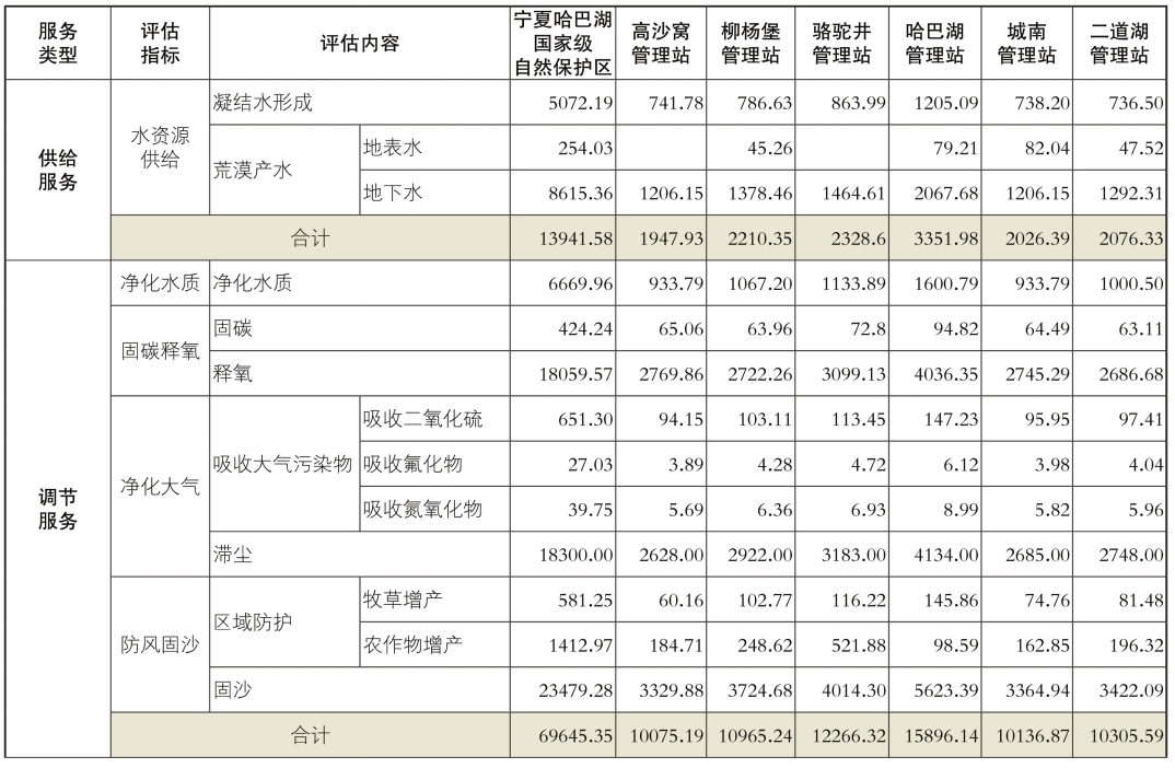表4-2 保护区6 个管理站荒漠生态系统服务功能价值量(单位:104 元·a-1)