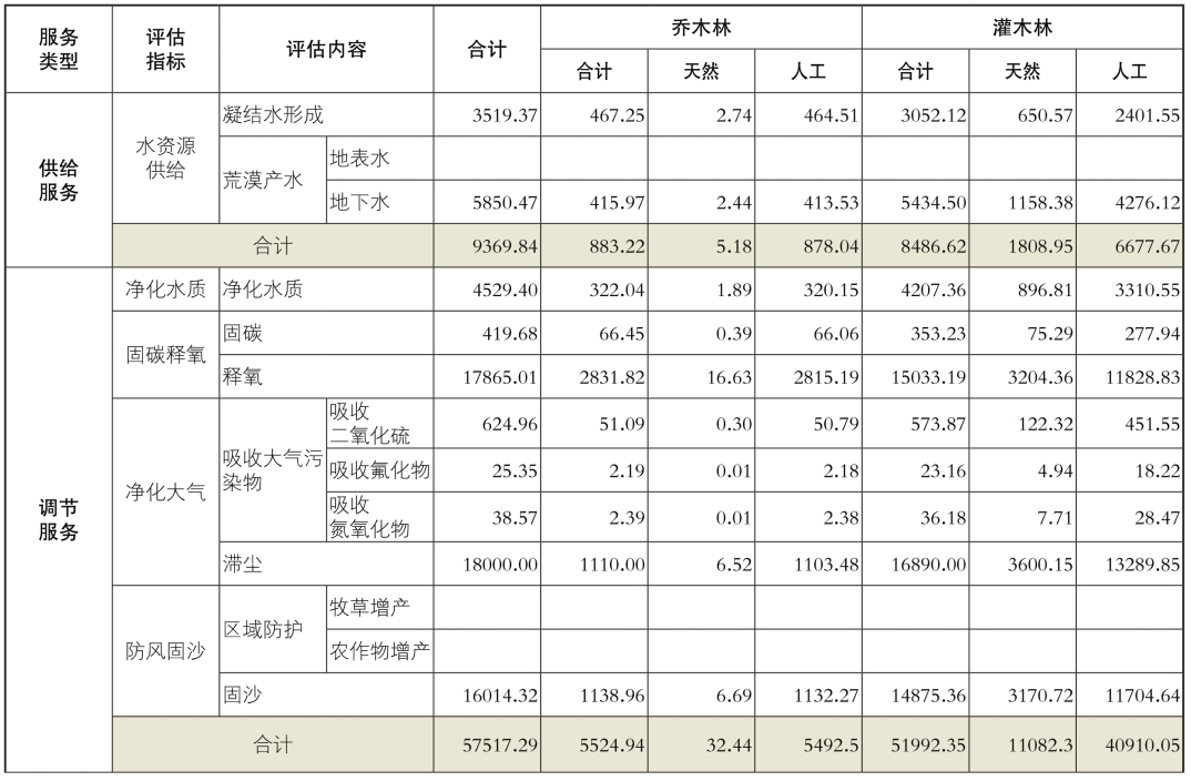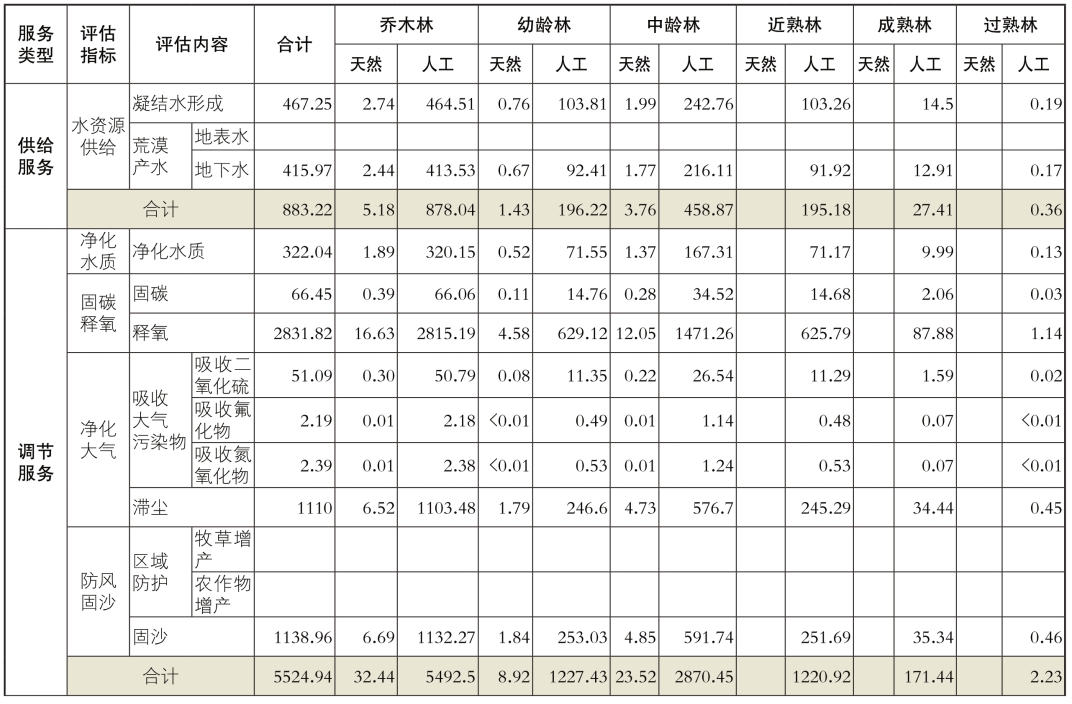 表4-5 保护区荒漠生态系统不同龄组乔木林服务功能价值量