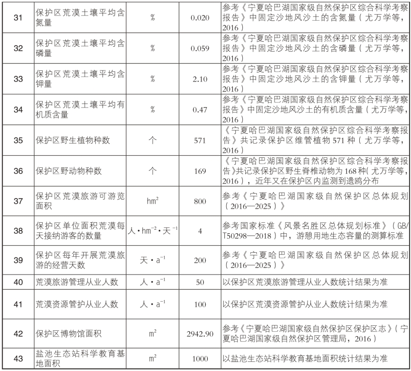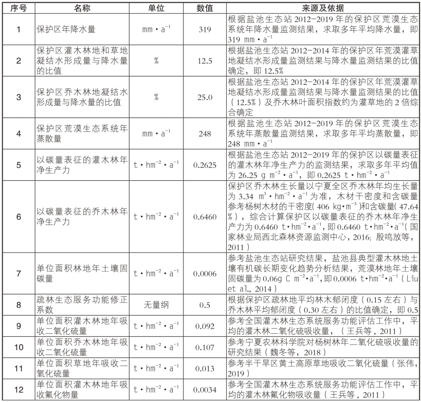附表1 宁夏哈巴湖国家级自然保护区荒漠生态系统服务功能物质量评估参数表
