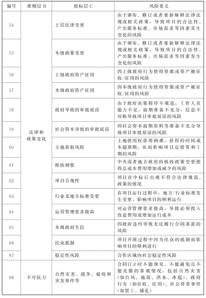 法律和政策的变更可能造成项目成本增加,严重的可能造成项目失败或被迫中断等,也可能因政策鼓励为项目带来相关补贴或降息,节省项目成本支出。此外,我国PPP实践时间还不长,现有PPP立法层级较低、效力差,在实践中不断出现新的问题,预期会对PPP项目产生较大影响。