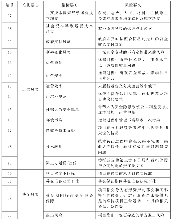 项目在移交期间,项目移交不达标风险、移交设备状况不佳风险以及移交期间持续安全服务保障风险由社会资本承担,退出风险根据责任方归责进行分担。由于PPP模式在我国兴起的时间较短,现进入移交阶段的项目较少,多是以学术理论和少量案例为基础,分析识别出移交风险并根据风险责任方进行分配。
