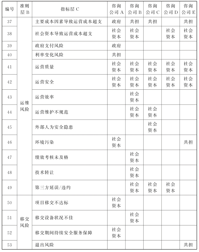 项目进入运营期之后,风险在政府各单位与项目公司之间分配。运维的关注点主要集中在运营质量和绩效考核这两大方面,更多的是由社会资本接管,因此在此阶段遇到的风险,多是由社会资本承担。但不排除特殊事项,在运维风险分配中依旧本着责任方在谁就由谁承担的原则。同建设风险一样,这五大实施方案在运维风险分配中意见基本一致,可供其他项目准备时参考。
