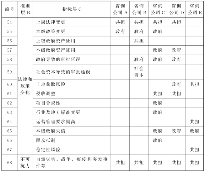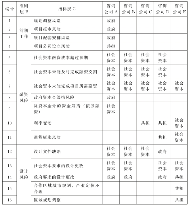 依据4.2.1节中的风险分配原则以及实施方案中已有的风险分配策略,分析同一风险在不同咨询公司方案中应当如何在政府和社会资本间进行分担,得出前期工作风险、法律和政策变化风险主要由政府承担,融资风险、设计风险、建设风险、运维风险、移交风险主要由社会资本承担,不可抗力风险由双方共担。具体风险分配见表4-2。