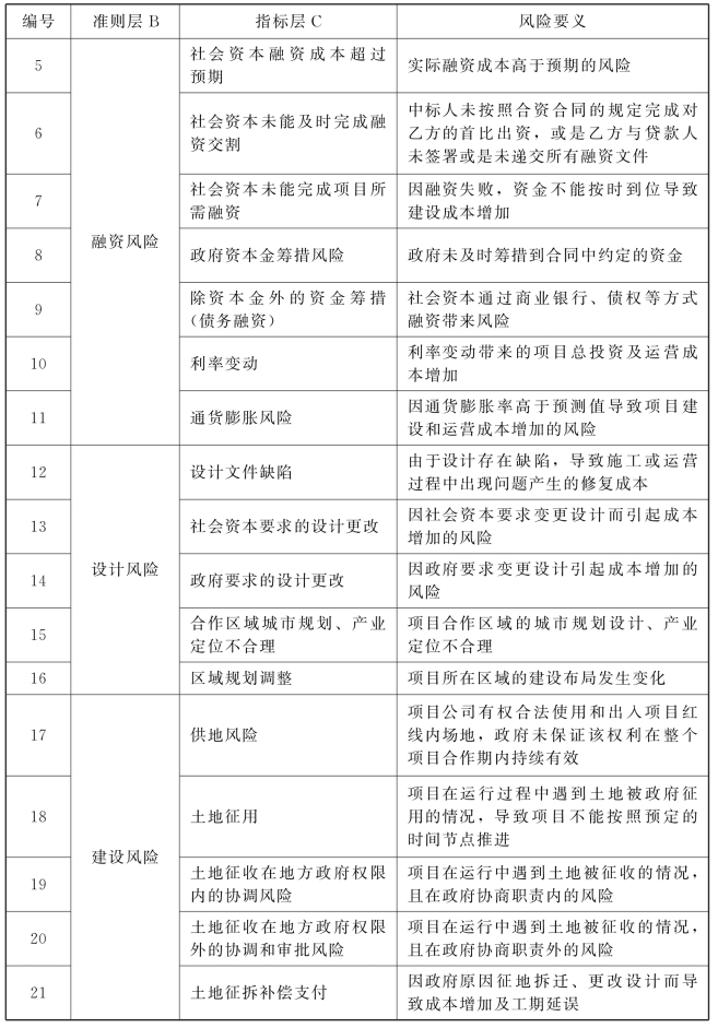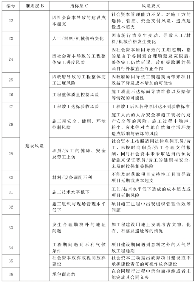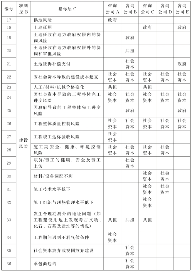 建设期是工程项目可识别出较多风险因素的阶段。笔者总共得出20个建设风险因素,风险主要由社会资本承担。在风险分配中,除了在土地征拆补偿支付中有差异,各实施方案的风险承担方分配基本一致,说明关于建设风险的分配,典型的风险分配方案基本已经达成一致意见,其分配意见可供其他项目准备时参考。
