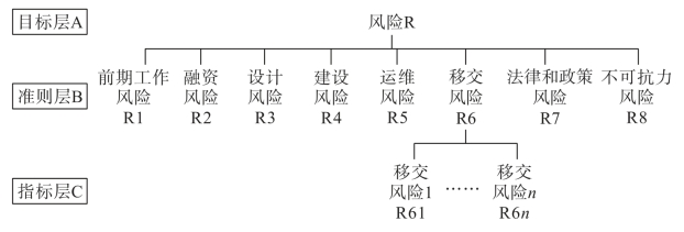 本节在RBS模式指导下,根据RBS运用流程,首先进行材料收集,以5个已有的典型实施方案为蓝本,然后从中识别出主要风险因素,得到8类风险类别,最后整理并总结这5个实施方案中的风险类别,依据WBS下的项目阶段分割,得到最终的RBS,如图4-1所示。目标层是风险,准则层分别是前期工作风险、融资风险、设计风险、建设风险、运维风险、移交风险、法律和政策风险、不可抗力风险,指标层根据各个方案下的风险类别及其主要风险进行整合,总共分为8类68个风险因素。