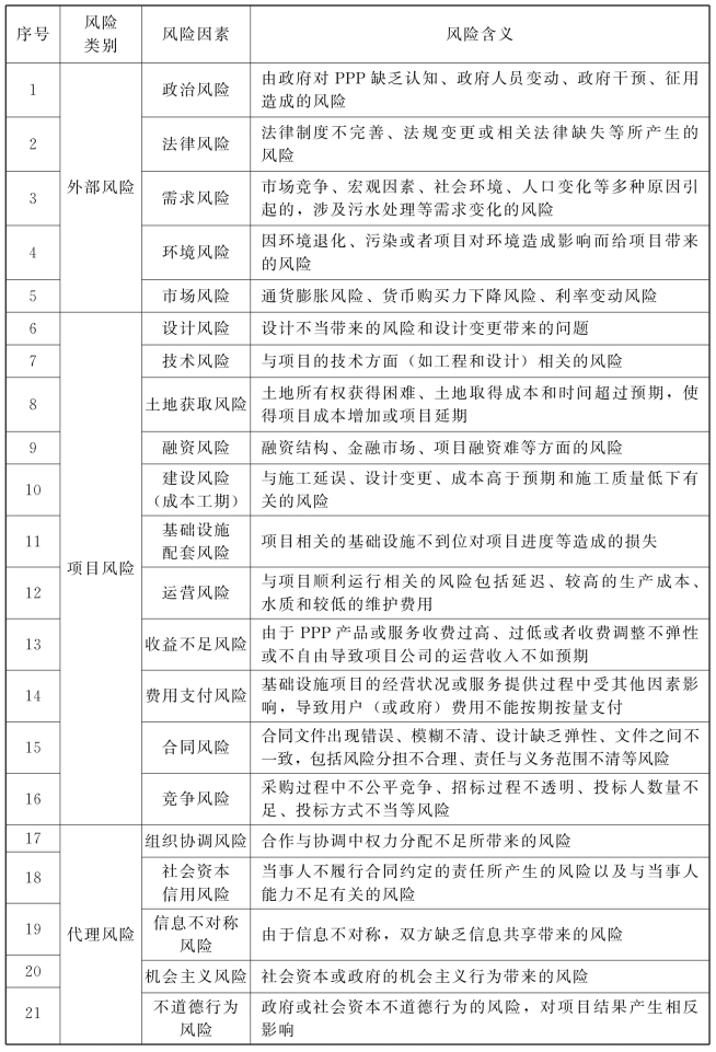 为了从政府的视角识别风险,本书对部分风险因素的内涵进行了重新表述。为了确定所提供的清单是否全面,以便对中国PPP项目的风险回流现象进行分析,笔者开展了一项涉及6名PPP项目咨询顾问的调查,受访者认为所提供的清单包括主要风险,并补充了2个风险——机会主义风险和不道德行为风险。综上列明的21项风险因素及其含义见表5-1。