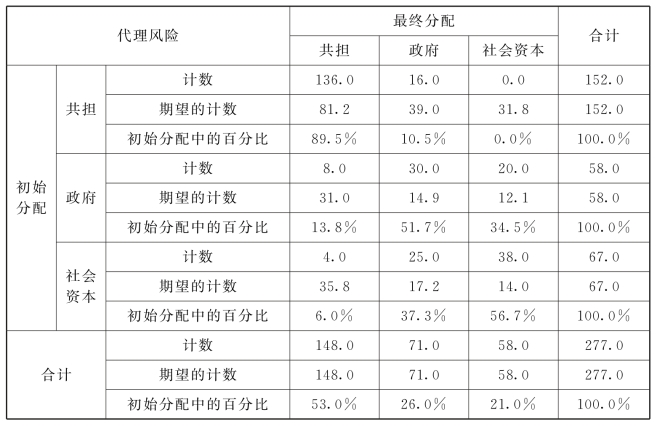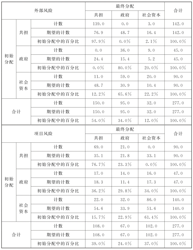 基于初始分配数据和最终分配数据的统计结果,本节采用同质性卡方检验比较两组数据,即风险初始分配及最终分配两个群组分配给政府和社会资本的比例是否相同。该测试的目的是确定观察到的数字是否不同于偶然性或不同于预期,换句话说,是为了测试观察到的分布由偶然性引起的可能性。