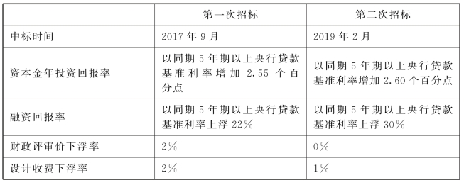 2018年12月,该项目重新启动招标程序,2019年2月项目中标人确定,通过比较两次中标结果边界条件,政府给予的项目回报明显提升,对比结果见表5-4。