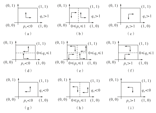 当q 0>1,即a 1+y 2-f>0时,可参看图5-3中的(a)、(b)、(c),无论政府是否采取“激励”政策,社会资本的最终策略都会趋向于“积极合作”来管理已经发生的风险;当q 0<0,即a 1+y 2-f≤-y 3时,可参看图5-3中的(g)、(h)、(i),无论政府是否采取“激励”政策,社会资本的最终策略都会趋向于“消极合作”;当0≤q 0≤1,即-y 3≤a 1+y 2-f≤0时,可参看图5-3中的(d)、(e)、(f),此时社会资本的策略会因政府的策略变化有所不同,当政府选择“激励”策略的比例大于时,社会资本的最终选择会向“消极合作”方向收敛,反之则倾向于“积极合作”。