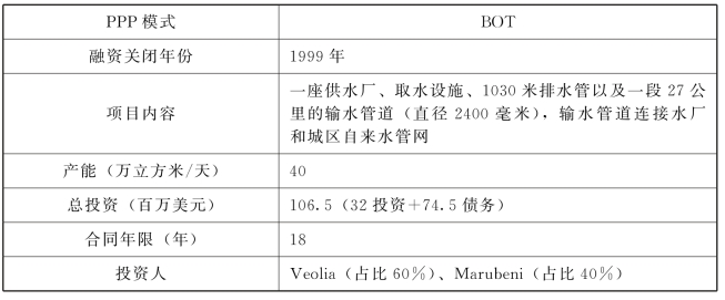 CD项目位于中国四川省成都市。在20世纪90年代末,成都市对自来水的日需求量已达到130万立方米,而当时的日供水量仅有105.3万立方米,缺口高达25万立方米。水源污染导致原有水厂产水量进一步减少,使缺水问题变得更加严峻。为缓解饮水危机,当时的成都市政府(CMG)启动了一项新的水厂发展计划,包含若干水厂项目。其中,CD项目是唯一采用PPP模式的项目。CD项目最早于1993年提出,拟采取传统的政府主动方式开发,但很快由于融资困难而中止。1996年,借助中央政府发起的“国家试点BOT计划”,该项目得以重新启动。同年,项目面向全球公开招标,最终法国的Compagnie Genenerale des Eaux Group(现Veolia Group)和日本的Marubeni Corporation赢得特许经营权。随后,Cheng Du Genenerale des Eaux-Marubeni Waterworks Co.,Ltd.作为项目公司成立,并立即着手项目建设工作。项目特许经营期为18年,包括建设期2.5年、运营期15.5年。项目的实际商业运行始于2001年,所生产的自来水由当地的国有公用事业公司——成都自来水总公司(CWGC)负责购买。在18年特许经营期满后项目必须移交回成都市政府。目前,项目已于2017年8月10日顺利完成移交。表6-2总结了成都自来水六厂B厂项目的概况。