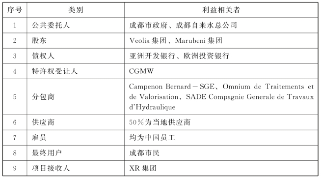 本节中,CD项目包含九类利益相关者。Liu等[117]识别出其中八类:公共委托人、股东、债权人、特许权受让人、分包商、供应商、雇员和最终用户。本节识别出的另一个利益相关者是成都市政府指定的项目接收人——国有企业XR集团。CD项目主要利益相关者见表6-3。