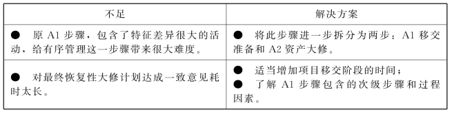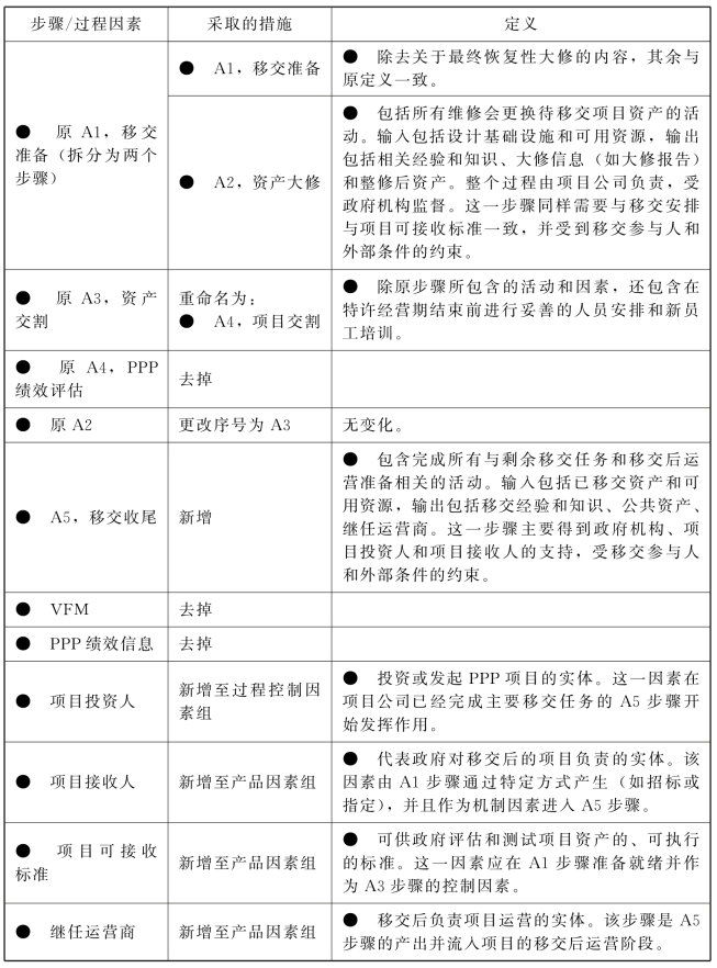 在GTPM中,原来的的A1步骤被拆分为两个步骤:移交准备(A1)和资产大修(A2)。这一改变的目的是将移交的准备工作同项目资产的大修分开,以便这两个过程的边界能够更加清晰,开展更加有序。这一改变还可以提醒移交管理的实践者,项目移交阶段的首要任务是为移交过程制订一个全面、可行的计划。为此,双方应充分利用各自的资源和智慧,有效率地就有关安排达成共识。当移交安排与相关细节确定后,项目公司则可进行后续大修工作,此时政府机构的工作重点转变为大修监督。由于移交的计划制订过程(A1)和计划的实施过程(A2)划分清晰,从业者可以充分认识到自身责任动态变化和每一步的工作重点,对投入项目移交阶段的有限资源和精力进行合理配置。