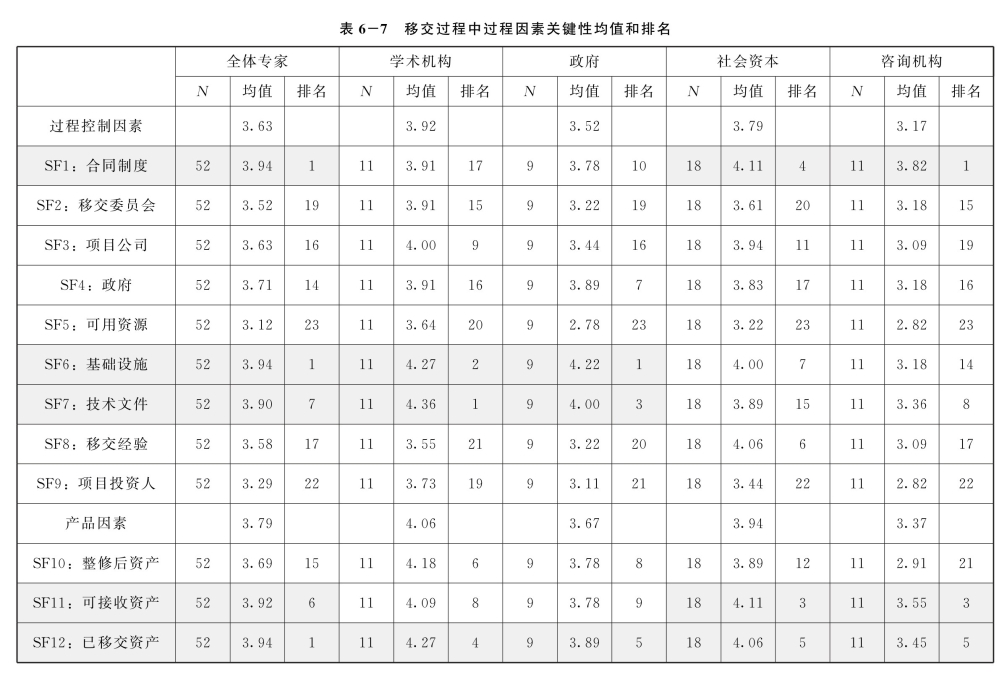 在对所有调查回收的数据进行均值分析后,确定了23个移交过程因素的关键性平均值,范围从3.94到3.12不等。表6-7显示,7个因素的均值超过3.9,13个因素的得分在3.5至3.9之间,其余3个因素显示的均值在3.12至3.5之间。在得分超过3.9的7个因素中,前5个得分均为3.94。多个过程因素得分并列第一的情况在过去的PPP研究中极为罕见。事实上,表6-7前两列标为灰色背景的前11个因素之间的差异很小,不到0.17。这表明,根据专家受访者的评估,GTPM过程因素的关键性彼此是十分接近的。