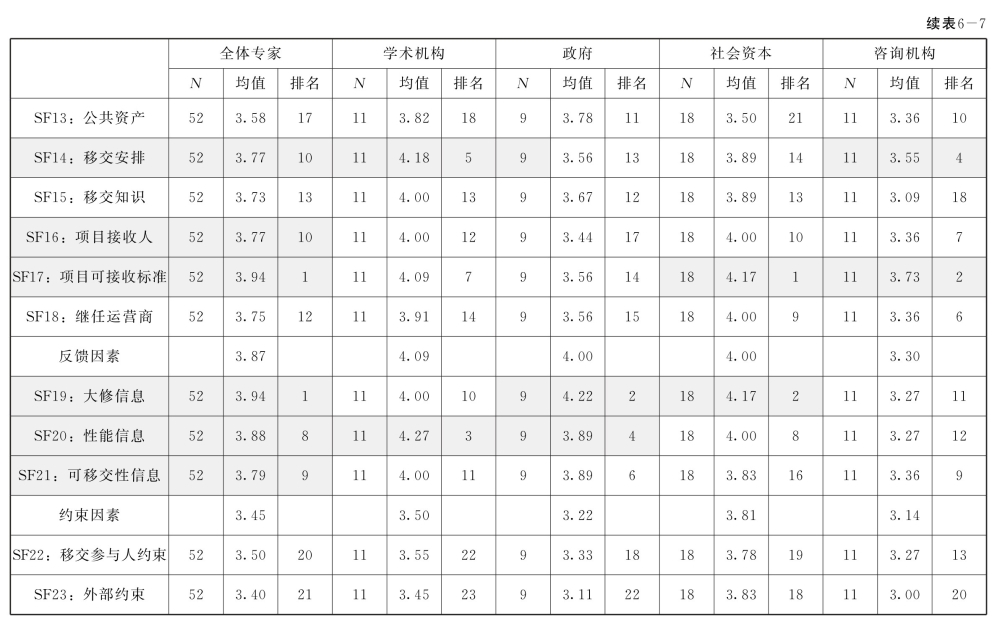 但是,可以注意到的是,来自不同利益相关者的专家受访者做出的评估存在一些有趣的差别。学术机构受访者通常对过程因素关键性的评分最高,而咨询机构受访者给出的评分最低。其余的受访者大多数来自政府和社会资本,给出的评分接近平均水平。此外,观察四类利益相关者中每一类利益相关者下方关键性得分最高的5个因素(表6-7中四类利益相关者下方灰色背景部分)可以看出,学术机构、政府和社会资本对大多数因素给出的评分都超过4.0,而咨询机构对所有5个因素给出的评分均低于4.0。此外,就不同利益相关者挑选的5个关键性最高的因素的具体清单而言,学术机构和政府的结果几乎相同(例如SF6、SF7、SF12和SF20),而社会资本和咨询机构的结果则大致相似(例如SF1、SF11、SF12和SF17),这正如表6-7中每类应答者下方标为灰色背景的因素所示。