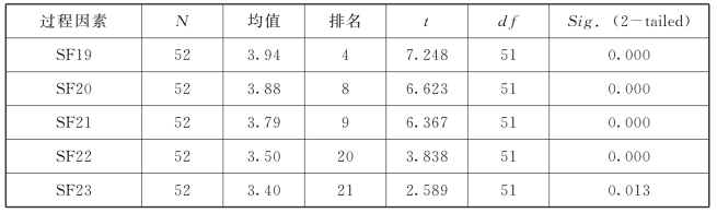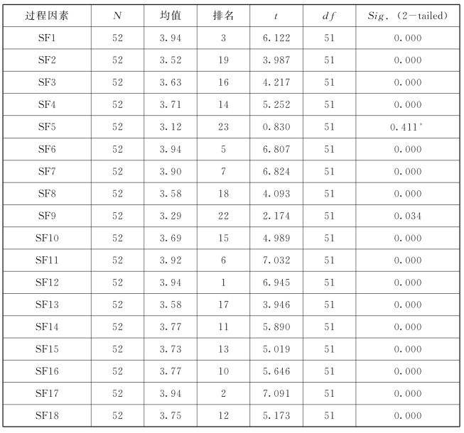 本节进行了单样本t检验,以检查GTPM中各个过程因素的关键性平均值是否具有统计学意义,设定的检验值为3.00,P值为0.05,置信度为95%,借此对CTSF进行了识别。原假设H0是指“均值在统计学意义上显著”,而替代假设H1是指“均值在统计学意义上不显著”。如P值小于0.05,则应拒绝原假设。也就是说,如果P值小于0.05,那么该因素对于移交过程取得成功具有显著关键性,因此可被确定为CTSF。表6-8总结了GTPM过程因素关键性测试结果。从中可以看出,单样本t检验技术生成的所有P值[表6-8中显示为Sig.(2-tailed)],除“可用资源”的显著性水平为0.411(大于0.05),其余均小于0.05。这一结果表明,除“可用资源”,GTPM的所有过程因素在统计学上对于移交过程取得成功都至关重要,同时意味着识别了22个CTSF。