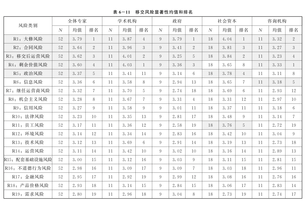 如表6-11所示,对于19个移交风险的显著性,所有应答者给出的均值范围为3.79至2.80。特别是R1至R4这四种风险的得分超过3.50,而R16至R19这四种风险的得分低于3.00。其余11个风险的均值介于3.00至3.37。将所有应答者排名前五位的风险与不同受访者组别排名前五位的风险(表6-11中灰色背景部分)进行比较可以发现,大多数应答者都认为前四种风险(大修风险、合同风险、移交后运营风险和剩余价值风险)似乎具有相对更高的显著性。但是,对于第五种风险(政治风险),不同类型的应答者表达了不同的意见。当分别进行观察时,可发现主要的四组应答者大致分为两类:学术机构和社会资本、政府和咨询机构。这一结果可能表明,中国的PPP学者和行业从业者比政府和咨询机构更加关注PPP项目的移交风险。在PPP领域,人们通常认为学术机构是中立的,具备相对更多的专业知识,因此其意见具有相对更高的可靠性[134];社会资本是唯一完整经历了一个具体PPP项目漫长生命周期的利益相关者;而大多数政府和咨询机构在处理PPP事务方面仍处于起步阶段。学术机构和行业从业者对中国PPP项目的移交过程因素关键性和移交风险显著性整体给出了相对更高的评分,这就提醒了政府及其获取专业建议的主要来源——咨询机构,要提升他们对中国PPP项目移交阶段问题的认识和重视程度。