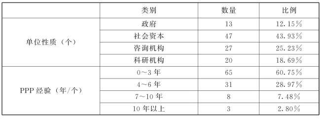问卷调研参与者在PPP项目中承担的主要职能或研究方向主要包括投融资、设计/建设、运营管理、咨询或顾问工作、监管及政策支持等。所有的问卷调研参与者都有PPP项目的实践或研究经历,而这些参与者在PPP项目中承担着不同的职能。此次问卷调研参与者在PPP项目中参与投融资工作的人数最多,有51人,占总人数的47.66%。其次是咨询或顾问工作,有27人,占总人数的25.23%。在PPP项目中承担投融资工作的参与者对投资决策有更直接和深入的认识,是PPP项目参与者中最了解投资决策工作的人群。承担咨询或顾问工作的人员通常需要从PPP项目整体进行全盘考虑,对PPP项目的生命周期流程也有更系统的认知。其他工作如设计/建设、运营管理、监管及政策支持都是PPP项目生命周期过程中不可或缺的一部分,承担这部分工作的专家能够从自身的工作出发,提供一些难以在投资决策初期发现的然而对后期实操过程存在一定影响的关键点。总体上看,本次问卷调研参与者基本涵盖了PPP项目生命周期中所有过程的重要角色,在一定程度上保证了本次调研结果的质量。