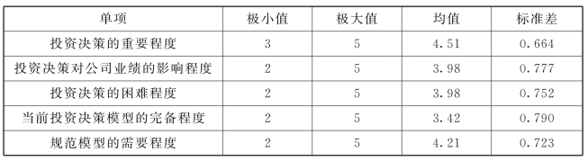 在问卷的第二部分,主要评估了参与者对投资决策的认识。其主要包括以下几个维度:投资决策的重要程度、投资决策对公司业绩的影响程度、投资决策的困难程度、当前投资决策模型的完备程度以及规范模型的需要程度。由表7-2可知,调研参与者认为投资决策的重要程度得分是4.51,投资决策对公司业绩的影响程度得分是3.98,得分都很高,说明投资决策在PPP项目整个生命周期中十分重要。当前投资决策模型的完备程度得分仅有3.42,说明在目前的PPP项目投资决策中,使用的投资决策模型还有待改进。而投资决策的困难程度得分是3.98,规范模型的需要程度得分为4.21,说明做出一个有质量的投资决策存在难度,需要规范的决策流程和模型协助决策。