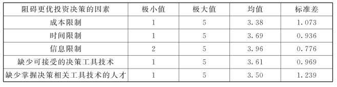在对当前参与者投资决策认知的分析中,得知我国PPP项目当前使用的投资决策模型的完备程度较低,还有待改进。问卷中提出了五个可能会阻碍投资者做出更优投资决策的因素,包括成本限制、时间限制、信息限制、缺少可接受的决策工具技术、缺少掌握决策相关工具技术的人才。表7-4列出了问卷调研参与者对这些因素的评价,这些因素的得分都是3.00以上,可以看出问卷调研参与者对这些阻碍更优投资决策的因素都比较认同。其中,得分最高的因素是信息限制,其次是时间限制,得分分别是3.96和3.69。这是因为在前期投资决策阶段,投资人获取的信息是有限的,且需要在招标公告公布之后的约定时间之内做出相应的投资决策及投资方案。此外,缺少可接受的决策工具技术、缺少掌握决策相关工具技术的人才两项因素的得分也不低于3.50分。而实际上并不缺乏决策工具技术,而是由于企业或投资人自身的原因导致对决策工具的不了解。