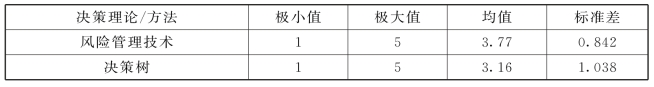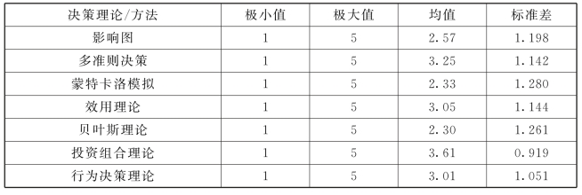 表7-3展示了问卷调研参与者对各种决策理论/方法的了解程度。其中风险管理技术与投资组合理论的得分较高,分别为3.77与3.61,这两种方法在当前PPP项目中使用较多,因此参与者对这两种方法的了解程度更高。而影响图、蒙特卡洛模拟、贝叶斯理论的得分均低于3,决策树、效用理论、行为决策理论的得分虽然高于3,但总体看来得分都偏低。这说明投资人对决策分析理论和方法的了解程度不高,在PPP项目实际投资决策操作过程中,这些决策分析理论与方法的使用频率也不高。