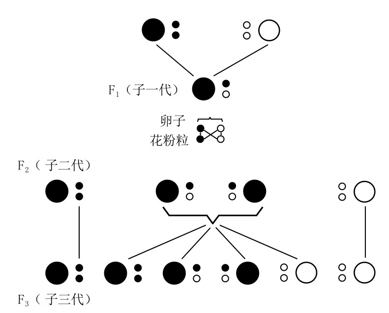 孟德尔以一个简单的测试验证了其假设的真实性。他将子二代所得矮茎与子一代所得高茎杂交,观察杂交后所得的F3杂合子的生殖细胞中是否出现了高茎和矮茎这两种要素,同时观察F3杂合子是否出现1:1比例的高茎和矮茎(如图2)。实验表明,结果的确如此。