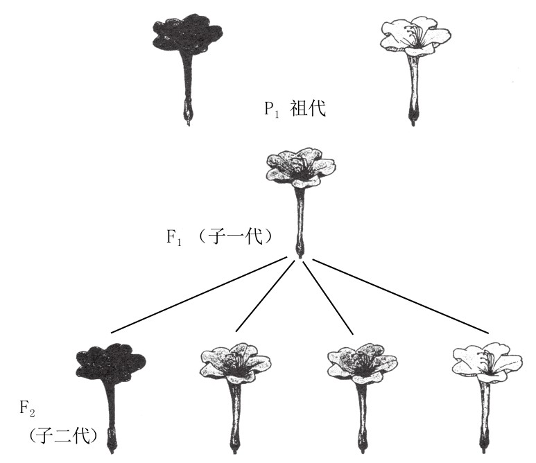 或许,另外一些物种的杂交对于孟德尔第一定律会有更为直观的解释。譬如,将红花紫茉莉植株与白花紫茉莉植株杂交,所得的子一代杂合子全是粉色花朵的紫茉莉植株(如图5)。如果将子一代粉花紫茉莉的杂合子自花授粉,那么在所得的子二代杂合子性状中,会出现祖代[13]的红花、子一代的粉花和祖代的白花,且红花、粉花和白花的比例为1:2:1。若两个带有红花基因的生殖细胞相遇,子二代就会恢复出其祖代的红色花朵;若两个带有白花基因的生殖细胞相遇,子二代就会恢复出祖代的白色花朵;若红花基因和白花基因相遇,子二代便会出现子一代中的粉色花朵。子二代的所有花朵中,有色花朵和白色花朵的比例是3:1。