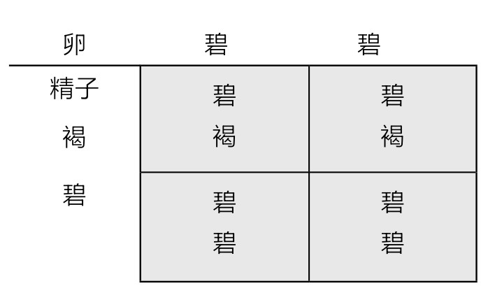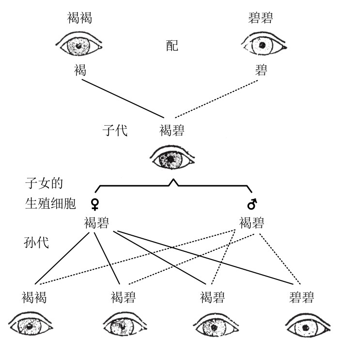 高茎豌豆和矮茎豌豆的关系,同样可以用人类眼珠颜色这一性状的遗传情况加以说明。碧眼人同碧眼人婚配,其后代的眼睛一定也是碧眼;褐眼人同褐眼人婚配,如果二者的祖先都是褐眼的话,他们所得后代的眼睛也必然是褐眼(如图3)。如果一个碧眼人和一个纯种褐眼人婚配,所得子一代的眼睛会是褐眼。如果子一代中的褐眼人彼此婚配,那么他们后代的眼睛中会出现褐眼和碧眼,且褐眼与碧眼的比例为3:1。如果杂种褐眼人(子一代褐碧)同碧眼人婚配,那么他们的子女一半是褐眼人,另一半则是碧眼人(如图4)。