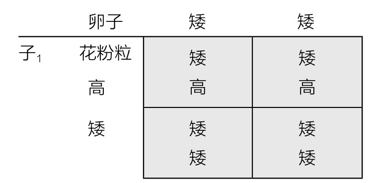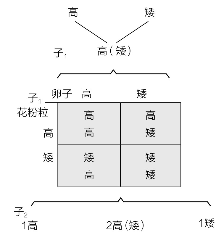 高茎豌豆和矮茎豌豆杂交,所得子一代都为高茎杂合子。子一代的配子(卵子和花粉粒)重新组合,所得后代如方格所示,杂合子二代中出现了3:1的高矮茎比例。