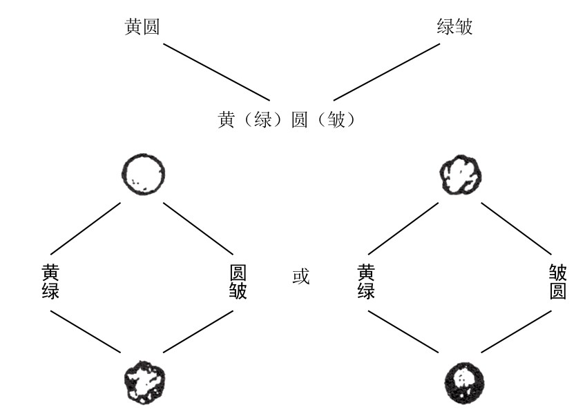 图7用以阐述黄圆豌豆和绿皱豌豆的孟德尔式遗传规律。图7下半部分是子二代中所得的四种豌豆:两种原始类型(黄圆豌豆和绿皱豌豆)和两种结合类型(黄皱豌豆和绿圆豌豆)。