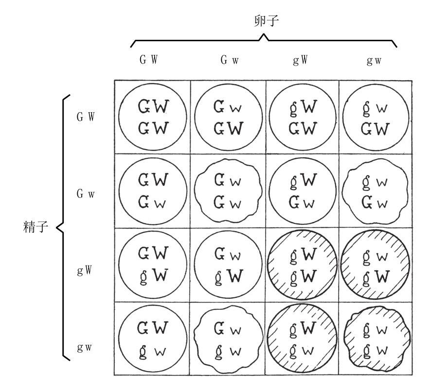 子二代中由四种卵子和四种花粉粒互相结合而产生的16种新组合(由纯种黄圆豌豆和绿皱豌豆交配所得子一代自交而产生,G:黄;g:绿;W:圆;w:皱)。