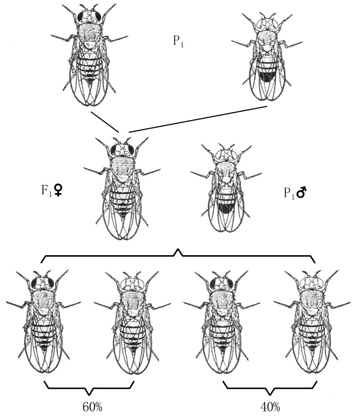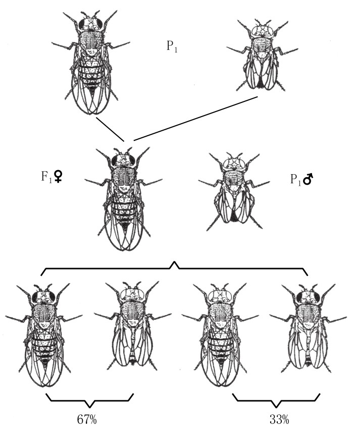 在杂交中,其他性状间的交换率会以不同的比例出现。例如,带白眼细翅这两种突变性状的雄果蝇与野生型红眼长翅的雌果蝇交配,其子一代都是红眼长翅果蝇(如图13)。若将子一代的雌果蝇(红眼长翅)和白眼细翅的雄果蝇交配,那么子二代会得到四种果蝇,其中和祖代一样有着白眼细翅和红眼长翅的果蝇共占67%,而新型白眼长翅和红眼细翅的果蝇共占33%。