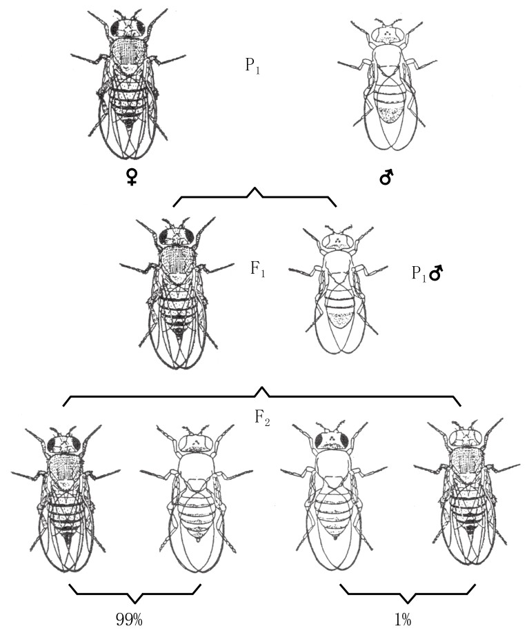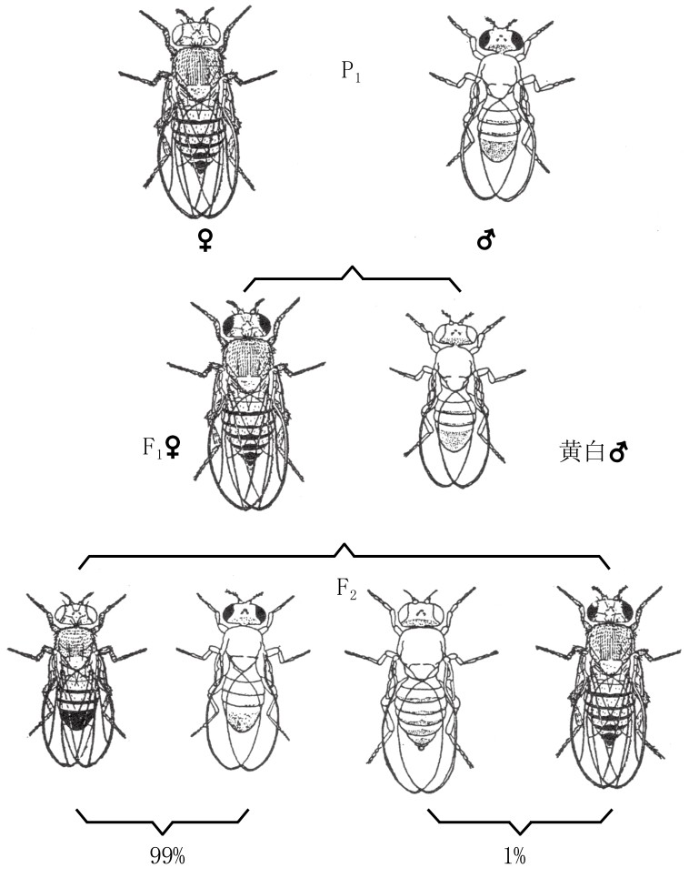 将之前同样的基因以不同的组合方式结合,我们还做了另一个相似的实验。如果让黄翅红眼的雄果蝇和灰翅白眼的雌果蝇交配,其子一代的雌果蝇为灰翅红眼。如果将子一代的雌果蝇与一只有着两组隐性突变性状的黄翅白眼雄果蝇交配,会得到四种类型的子二代。其中带祖代性状的黄翅红眼的果蝇和灰翅白眼的果蝇数量达到了99%,而新的组合性状,或者说是新型交换性状,即黄翅白眼和灰翅红眼,在第二代中仅占1%(如图12)。