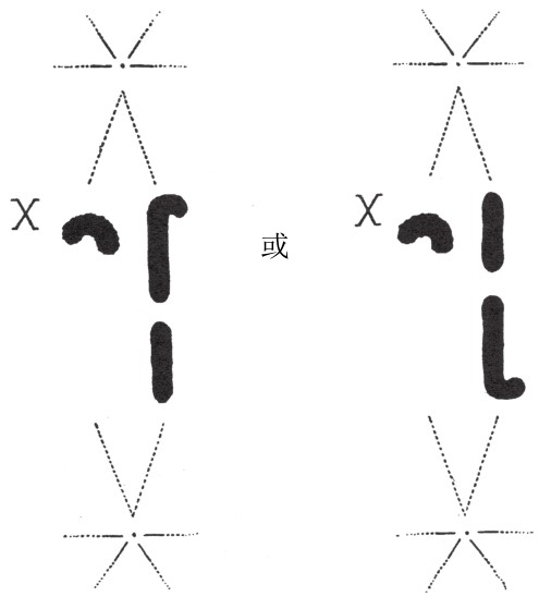 在这些蚱蜢中,雄蚱蜢存在某条无法组对的染色体,这条染色体与蚱蜢性别的决定有关(如图23)。当细胞成熟分裂时,这条无法组对的染色体会去向纺锤体的任意一极,且会成为其他成对染色体行动方向的“地标”。卡罗瑟斯(Carothers)女士是第一个观察到这一现象的人。她发现一曲一直的一对染色体,根据每一条染色体和性染色体的关系来看,这两条染色体分别去往哪一极是随机的。