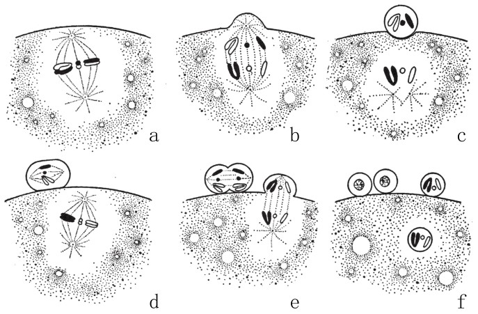 卵细胞的两次成熟分裂。第一次形成纺锤体,如图a。来自父方和母方的染色体互相分离,如图b。图c已分裂出第一极体[6]。图d已形成第二纺锤体,且每条染色体纵向分裂成两半(均分)。图e中,已分裂出第二极体。图f所示为在卵细胞核中只留下一半的染色体(单倍)。