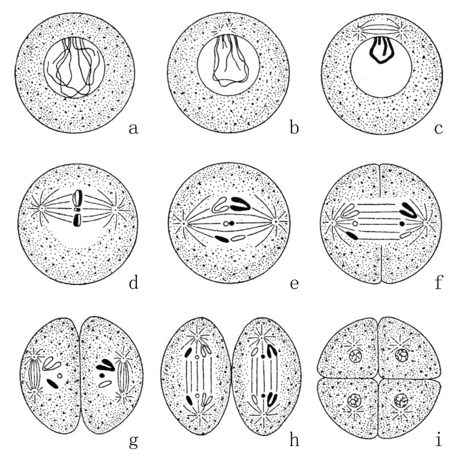精细胞的两次成熟分裂[4]。假定每个细胞含三组染色体,黑色代表来自父方,白色代表来自母方(a、b、c除外)。第一次成熟分裂是一次减数分裂,如图d、e、f。在第二次分裂或平均分裂中,每组染色体纵向地分裂成两条新的子染色体,如图g、h、i。