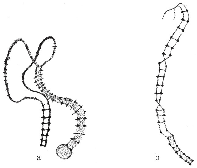 三肠涡虫的一对接合的染色体。a图中,两条细丝彼此靠拢;b图中,两条接合的细丝在两个平面相交。