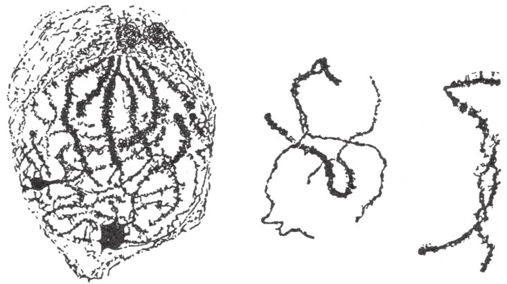 如果再研究一下分裂早期的图示,我们会发现大量图表中互相缠绕在一起的是细丝(细线期)[14](如图28),但细丝这一解释还存在很多疑点。实际上,我们要确定在如此纤细的细丝上,缠绕的接头点哪一个是上端哪一个是下端,是极其困难的。加之,细丝只能在凝固状态下染色后才能用显微镜加以观察研究,这更加大了观察上的难度。