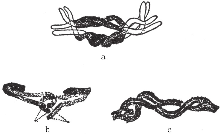 1909年,简森斯(F. A. Janssens)详细地解释了他所提出的交叉型学说[12]。先不提简森斯所提出的理论细节,仅他所提出的证据就可以证明在接合的同源染色体中的两条染色体之间,小块或片段地发生了交换,而这一交换可以追溯到早期这两条成对染色体缠绕在一起的时候(如图26)。