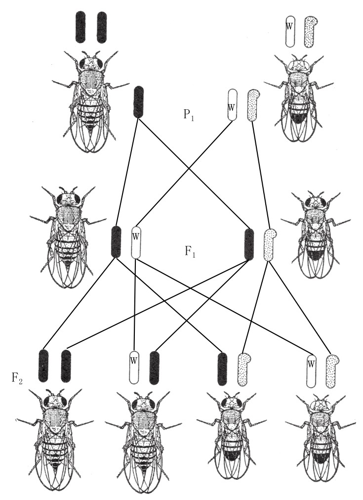 有时,一对果蝇会有四分之一的子代都是突变体。而且有证据显示,这种突变早已在某一祖先体内就出现了。但由于这些突变体都是隐性的,所以,如若不是含有这一突变基因的两个个体交配,这种突变性状便不会显现出来。因此,在它们(自交)的子代中,预计会有四分之一的个体显现出这种隐性性状。