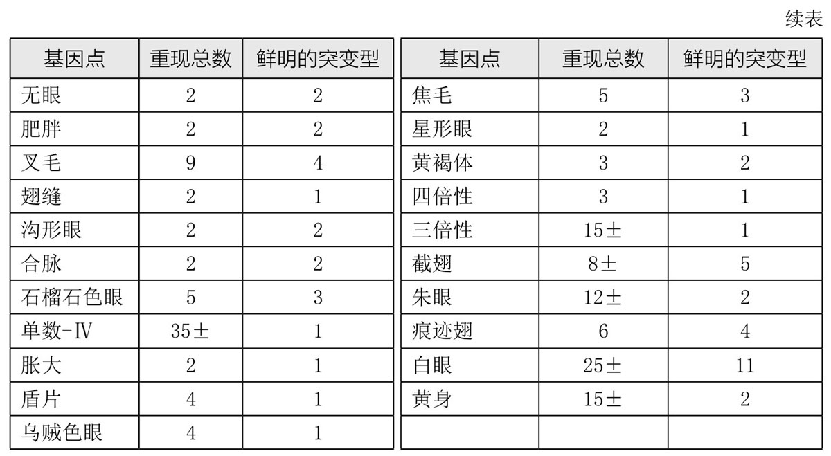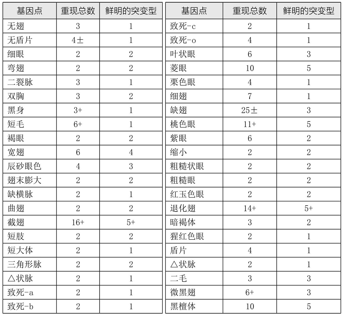 另一事实也在研究突变作用的过程中引起了我们的关注,即相同的突变可能一次又一次地重现。表1是果蝇突变重现的列表。相同突变的重现表明我们所研究的是独特而有序的过程。突变的重复出现让我们想起了高尔登(Galton)著名的多面体比喻。多面体的每一个变化都与基因的某个新的稳定位置相对应(这里或者用在化学意义上)。