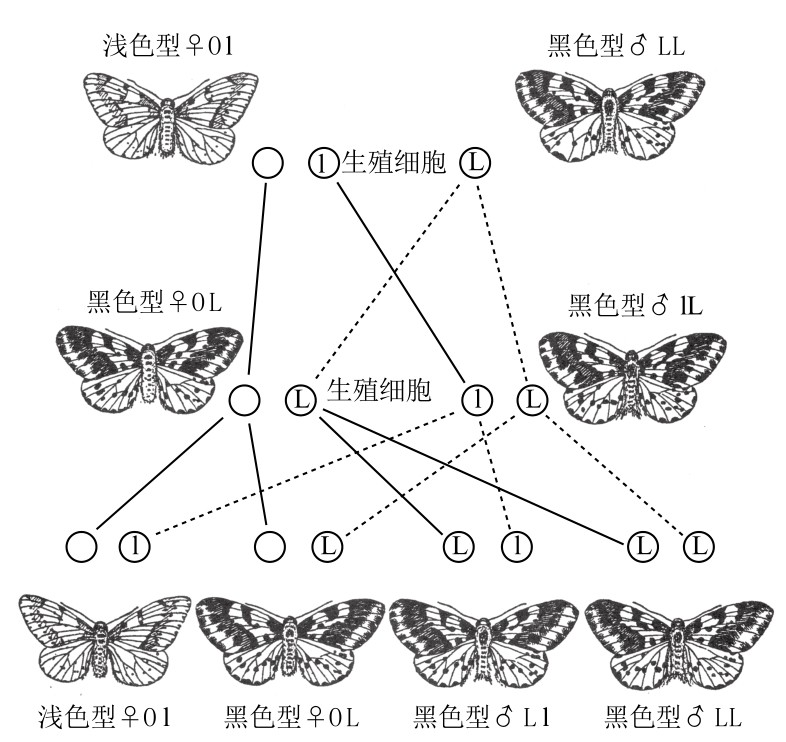 浅色型醋栗蛾和黑色型醋栗蛾的杂交。携带黑色基因的性染色体用带L的圆圈表示;携带浅色基因的性染色体用带l的圆圈表示;雌性蛾所独有的W染色体用无字母的圆圈表示。
