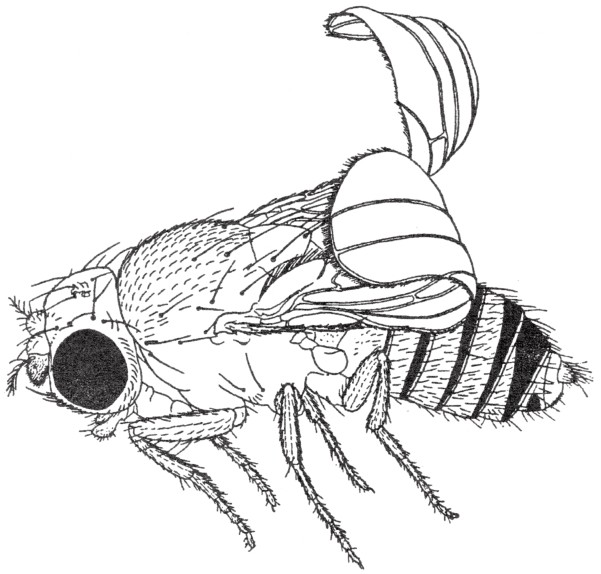 黑腹果蝇的突变卷翅性状:翅尾往上翻卷,且两翅稍微分离。