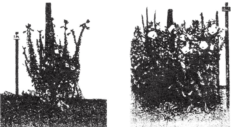 现已证实,其中一种突变型是因为染色体数量加倍,这种突变体被称为巨型(gigas)待霄草[9](如图42)。有一种突变型是三倍体,被称为半巨型(semi-gigas)待霄草。有几种突变型是因为出现了额外的染色体,被称为lata型待霄草和semilata型待霄草。至少有一种brevistylis待霄草和果蝇的隐性突变一样,两者都属于基点突变。而对于brevistylis待霄草和隐性突变的残余待霄草,才是德弗里斯所能用于研究引用的[10]。现如今,很有可能这种残余类型(隐性突变体)和果蝇突变类型是相似的,但它们在近几代中都会重现,这一点又与果蝇以及其他动植物的突变情况完全不同。有一个合理的解释或许可以说明这一现象,即这些隐性突变基因与存在的致死基因是紧密连锁的。只有当这些隐性基因通过交换作用,从附近的致死基因中分离出来时,这一性状才能表现出来。在果蝇中,有可能存在含隐性基因且与待霄草相似的平衡致死纯种。所以,只有当交换发生时,这些隐性基因才会重现,且其重现频率决定于致死基因和隐性基因之间的距离。