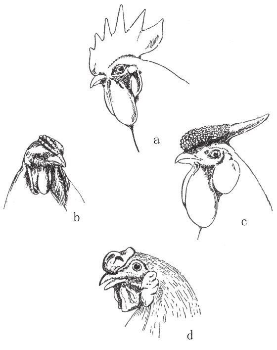 家鸡的冠型:图a为单片冠,图b为豆状冠,图c为玫瑰冠,图d为胡桃冠(其为豆状冠和玫瑰冠杂交所得)。