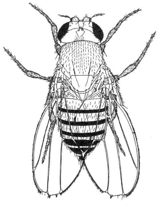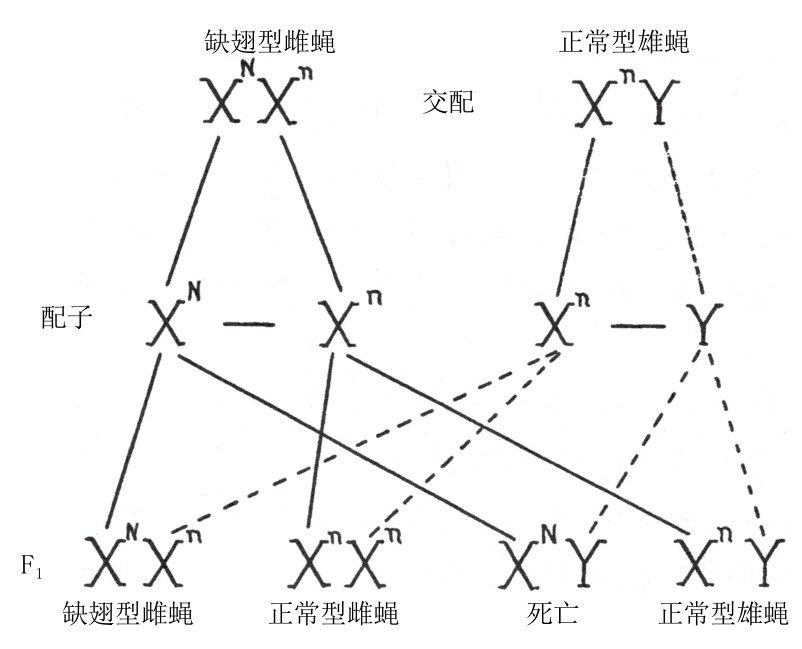 果蝇中存在几种突变型原种,被称之为缺翅型[5]。它们的翅端有一处或几处切口,第三翅脉加粗(如图44)。在缺翅型果蝇中,只有雌蝇能存活下来。任何含有缺翅基因的雄蝇都会死亡。缺翅基因位于X染色体上。现有一只雌蝇,其一条X染色体带有缺翅基因,另一条X染色体带有正常的等位基因(如图45)。在这只雌蝇成熟的卵细胞中,有一半带有缺翅基因,另一半带有正常的等位基因。如果它与正常的雄蝇交配,那么含X染色体的精细胞和携带正常X染色体的卵细胞结合,可得正常型雌蝇后代;含X染色体的精细胞和携带缺翅基因的X染色体的卵细胞结合,可得缺翅型雌蝇后代;含Y染色体的精细胞和携带正常X染色体的卵细胞结合,可得正常型雄蝇后代;含Y染色体的精细胞和携带缺翅基因的X染色体的卵细胞结合,所得后代都会死亡。综上,杂交结果是子一代果蝇的雌雄比例为2:1。