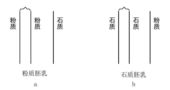 玉米的三倍型胚乳。图a所示为两个粉质基因和一个石质基因的存在产生粉质胚乳;图b所示为两个石质基因和一个粉质基因的存在产生石质胚乳。